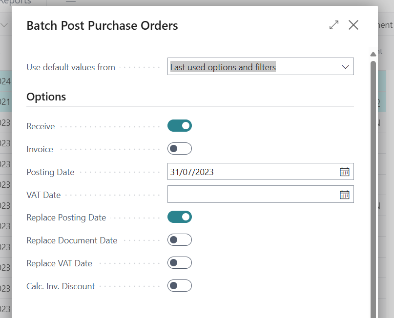 - Optional: Use the Replace Posting Date toggle if you want all selected orders to use the same date.